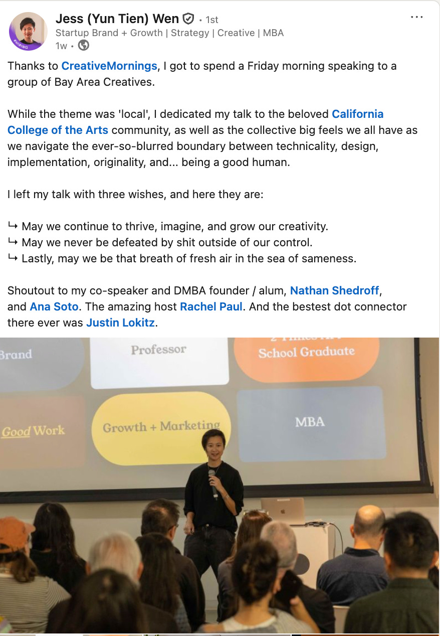 She also teaches. Jess runs a creative entrepreneurship course for undergraduate design students, a 15-week class that, in her words, makes her a better operator. “Teaching actually makes me better at my day job,” she says. “I see the parallel of people leaning into the skills they have and immediately wanting to flex that skill set.” Watching students default to building before defining the problem taught her something she now applies every day at work.